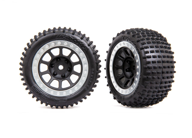 Alias® step-pin medium-compound tires provide excellent traction in dirt and other loose surfaces. Tires come pre-glued and mounted to 2.2" graphite gray multi-spoke rear wheels with foam inserts.