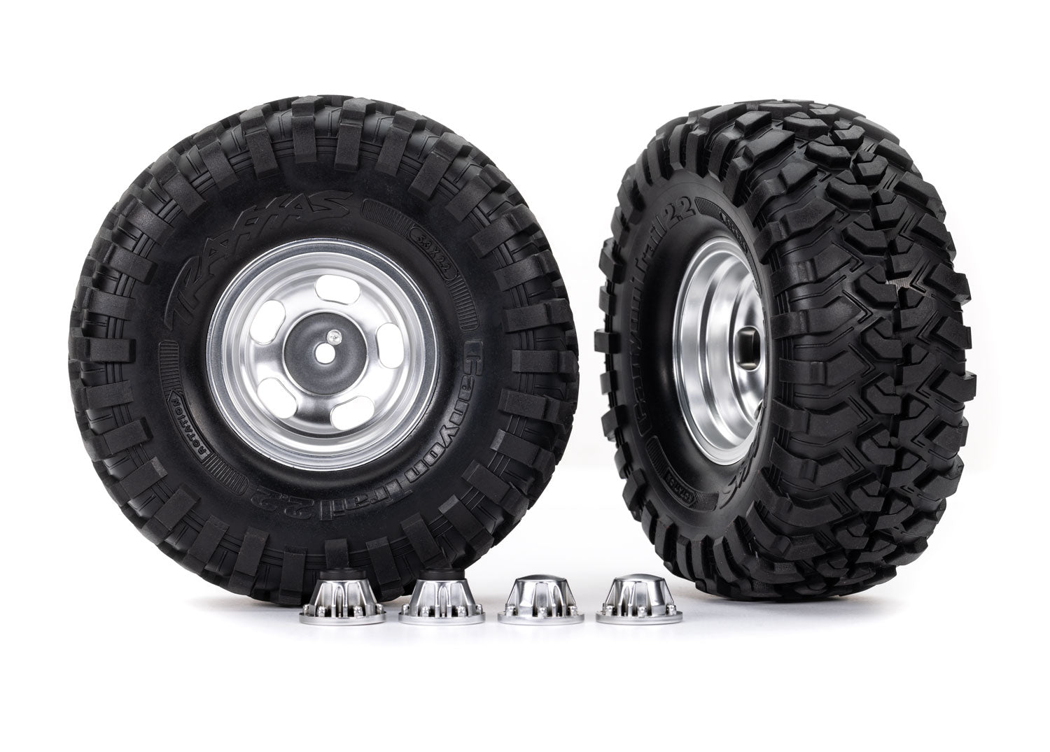 2.2" satin chrome slotted mag wheels come assembled and ready to mount with pre-installed foam inserts and mounted Canyon Trail 2.2" x 5.3" tires. Canyon Trail tires feature deep tread blocks for maximum traction on rough terrain with trail-tuned foam inserts for realistic climbing action. Includes center caps (4). Although designed specifically for the Ford® F-150® High Trail® Edition, the wheel and tire set fits all Traxxas TRX-4® models with a Long Arm Lift Kit installed.